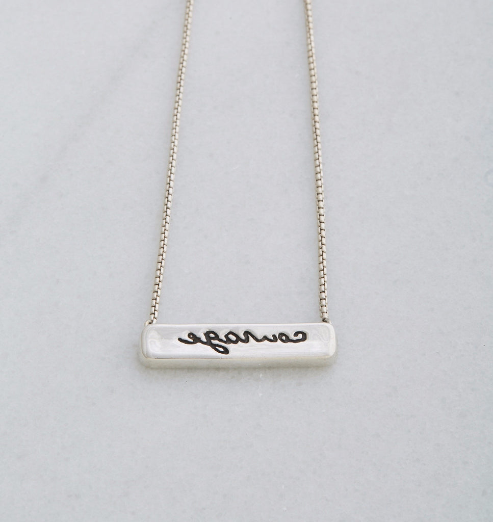 The courage to change the things we can. There is so much in this world over which we are powerless--the weather, the timing of the traffic lights, the moods of those we encounter throughout the day. And then there is what we can change: ourselves. We can change our outlook from gloomy to sunny, we can go instead of stop, we can turn our frown upside down. More easily said than done. And so this pendant. Whenever you flag or sag or just feel unequal to the task, look in the mirror and say to yourself "Courage." And then Act! About the Reflections Series: Inspired by the eroded and water worn look of buried treasure, these pendants have a worrystone-like surface, slightly concave, that begs to be touched, a comfort to hold. Each pendant has a word inscribed that can only be read when one is looking in the mirror, a private reminder to self reflect and continually take a fearless inventory. Comes on an 18" sterling silver box chain. Marked with "925" the international nomenclature for sterling silver. Designed and handmade in NYC they carry our mark on the reverse.