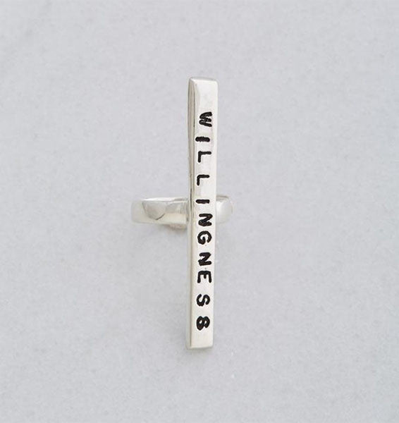 These rough-hewn, raw and hefty rings are cast in weighty chunks of sterling silver or brass. The letters are cast (rather than stamped) in the metal for permanence.